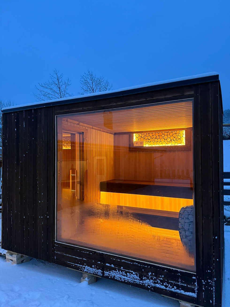 Designet for helårsbruk, gir denne kompakte, moderne saunaen deg en autentisk velværeopplevelse, enten du befinner deg på fjellet, i skogen eller i egen hage. Med panoramavindu får du en unik utsikt mens du nyter varmen – enten fra en vedfyrt ovn for en autentisk opplevelse, eller en elektrisk ovn for praktisk bruk og enkel temperaturkontroll.